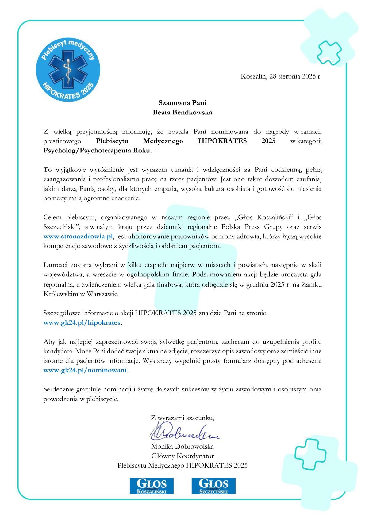 Jestem psychologiem i psychotraumatologiem. Ukończyłam studia magisterskie na Uniwersytecie HumanistycznoSpołecznym SWPS oraz studia podyplomowe- psychotraumatolog i psychogeriatra . Jestem też mediatorem Sądu Okręgowego w Koszalinie. Pracuję z osobami, które cierpią z powodu lęku, depresji a także przeżywają kryzys życiowy i utraciły poczucie sensu życia. Pomagam osobom mierzącym się z nadmierną agresją i silną zazdrością. Wspieram ofiary przemocy psychicznej. Specjalizuję się w zaburzeniach lękowych, fobii nastroju i snu oraz depresji. Prowadzę terapię par. Pracując w nurcie psychologii humanistycznej koncentruję się głównie na rozumieniu problemów i trudności pacjenta oraz wsparciu w ich rozwiązywaniu. Jako psychogeriatra pomagam osobom z diagnozą demencji i ich rodzinom w trudnym procesie adaptacji do nowej rzeczywistości. Przeprowadzam badania diagnozujące wyłącznie w oparciu o testy rekomendowane przez Polskie Towarzystwo Psychologiczne. Diagnoza ADHD osób dorosłych . Cały czas wierzę, że każdy człowiek posiada potencjał do przezwyciężania największych trudności. Mój gabinet jest przyjazny osobom z LGBT. Będąc mediatorem sądowym prowadzę mediacje sądowe i pozasądowe w zakresie polubownego rozwiązania sporów w zakresie kodeksu cywilnego i rodzinnego